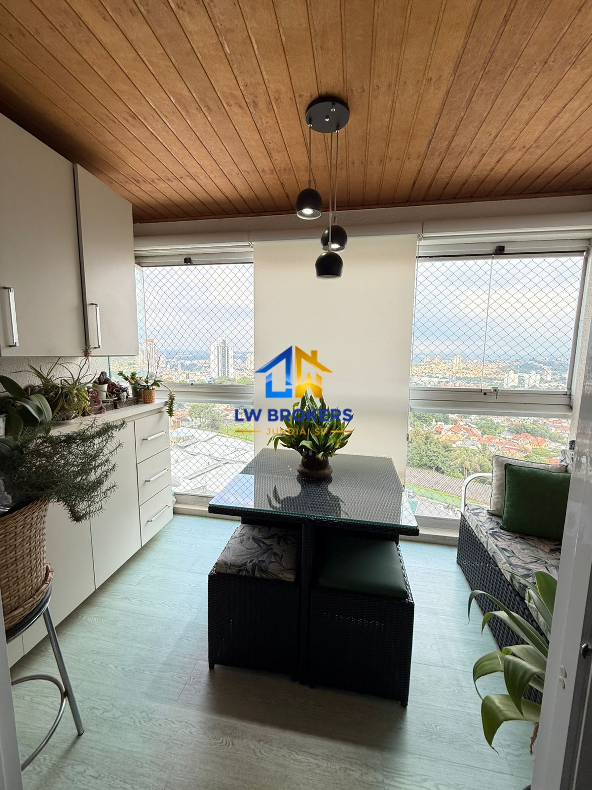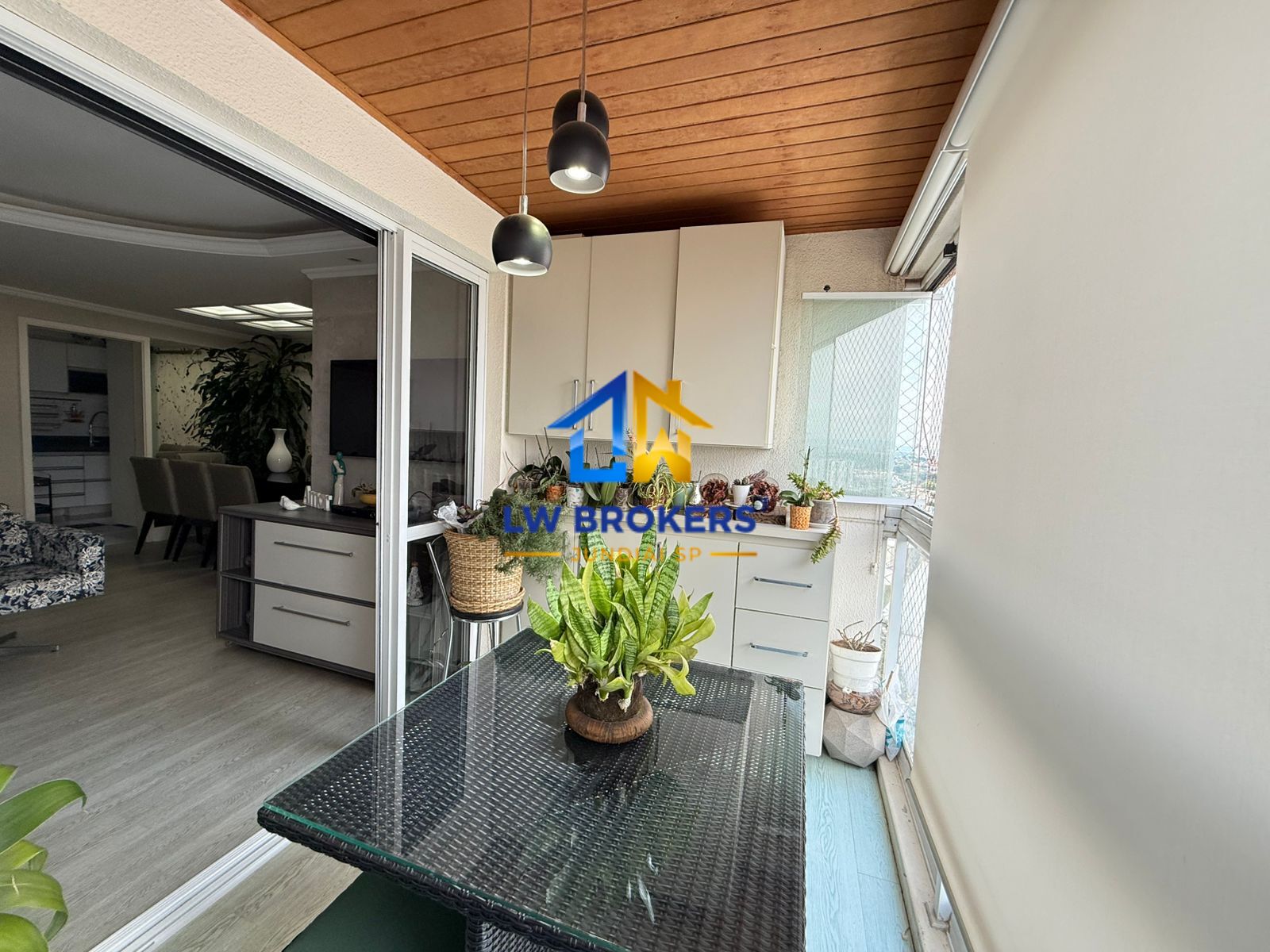 Terraço com armários planejado, envidraçamento, e cortinas blackout.