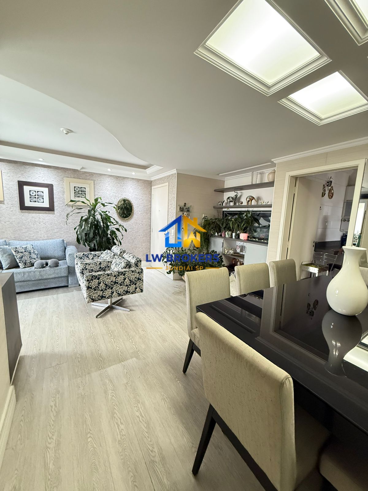 Sala de estar e jantar ampla com sanca de gesso e jogos de luzes.