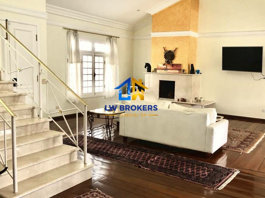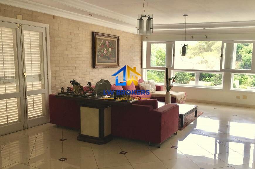 A área interna é composta por 4 amplas salas, uma lareira, sala integrada ao espaço externo ideal para festas, 4 suítes no piso superior, além de um quarto de hóspedes e um quarto de empregada no piso inferior.