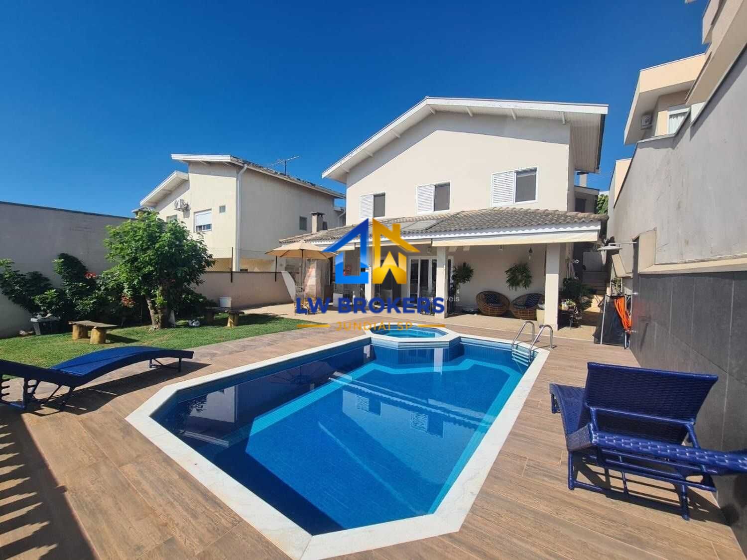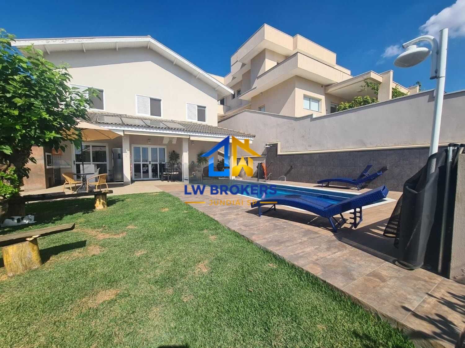 A casa ainda com piscina com água de sal, espaço gourmet com churrasqueira em mármore paraná, um grande espaço gramado, wc completo para piscina e tanque para dar banho nos pets.